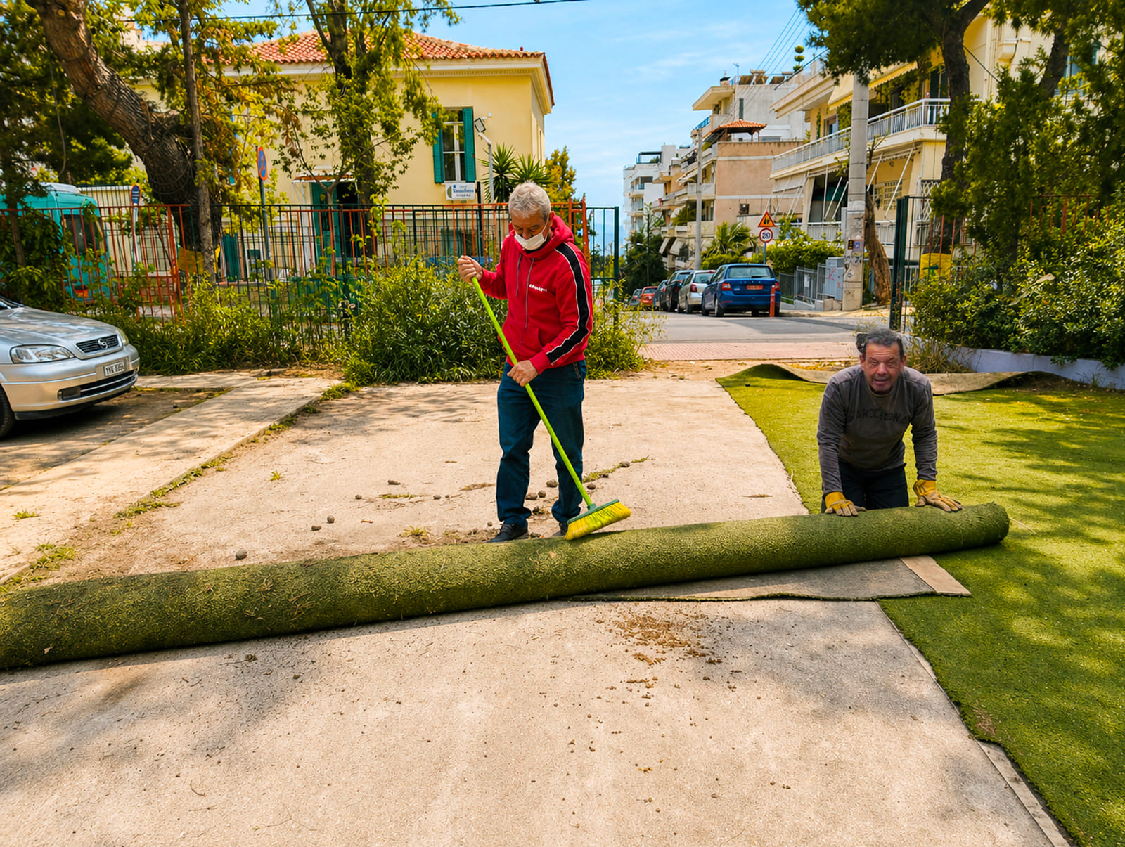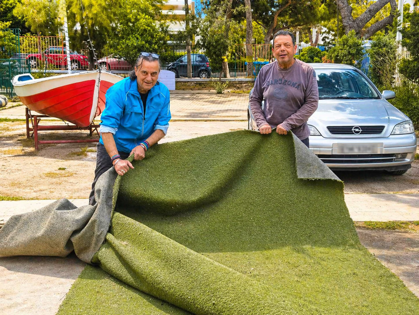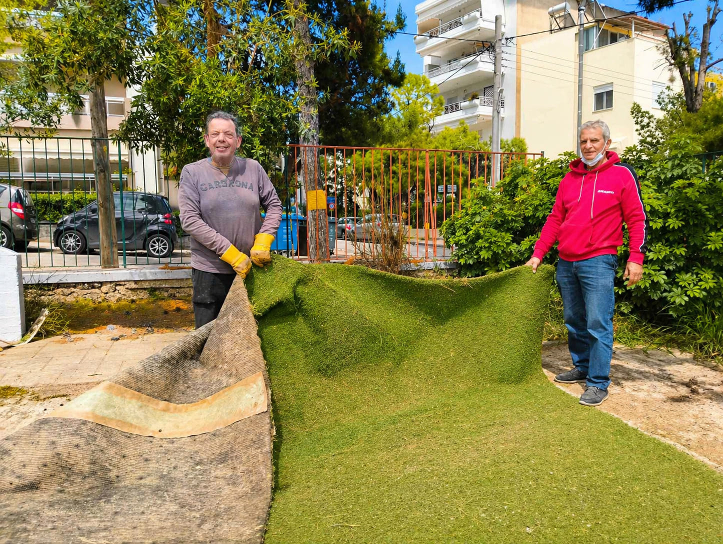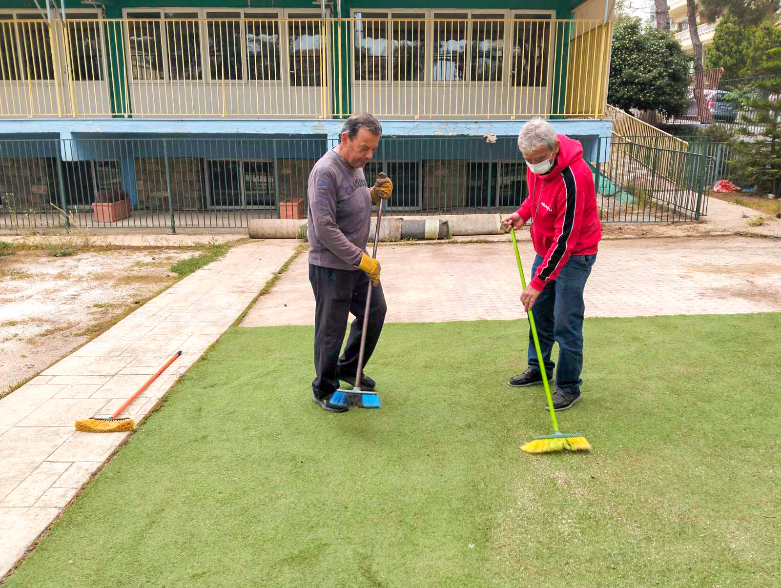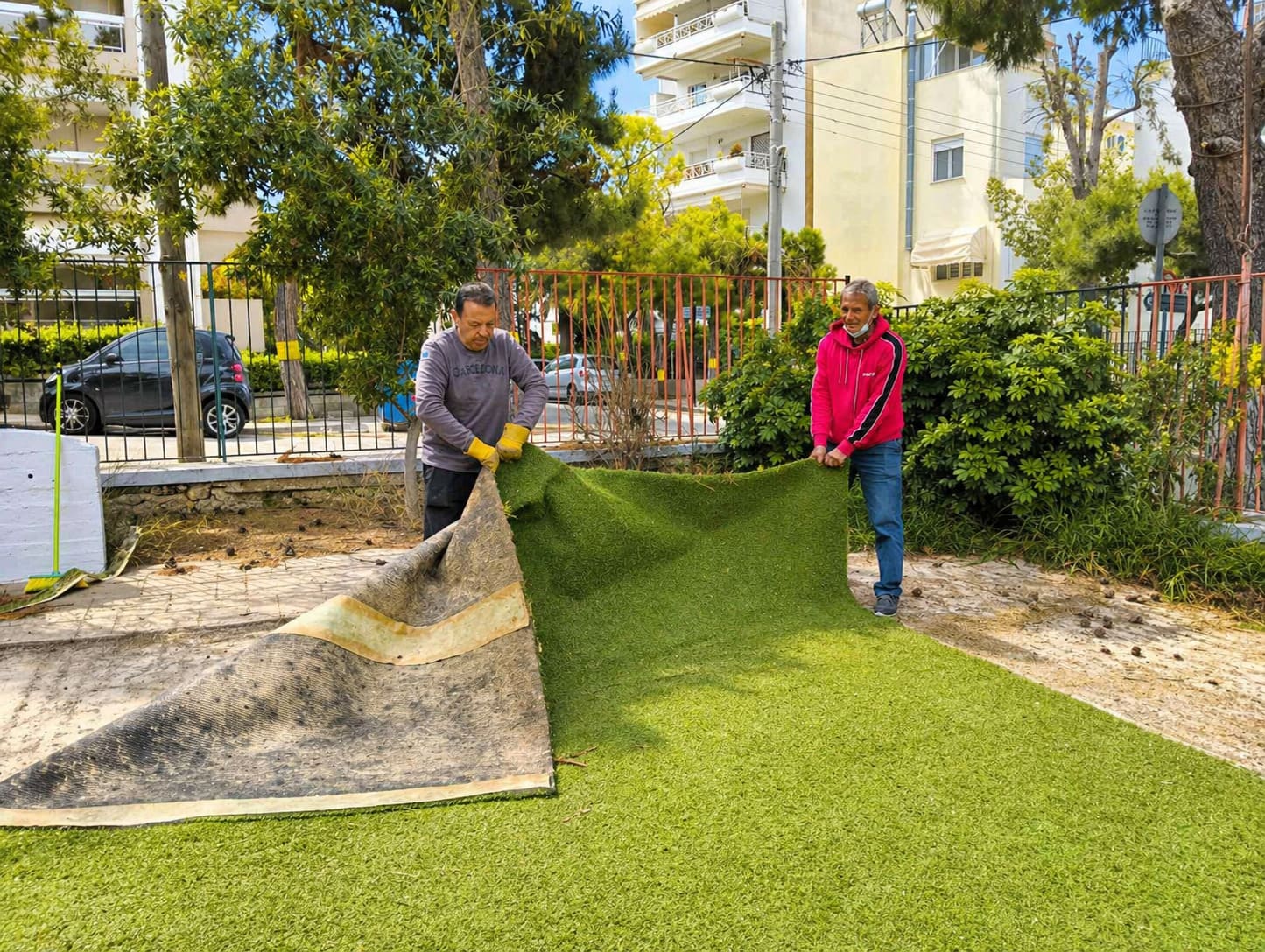 Με προσωπικό κόπο συνέβαλαν στη συλλογή, τη συγκέντρωση και την αποξήλωση των υλικών, ιδιαίτερα του τεχνητού τάπητα, ώστε όλα να είναι έτοιμα για τη μεταφορά και τη μελλοντική τους χρήση στο χωριό.