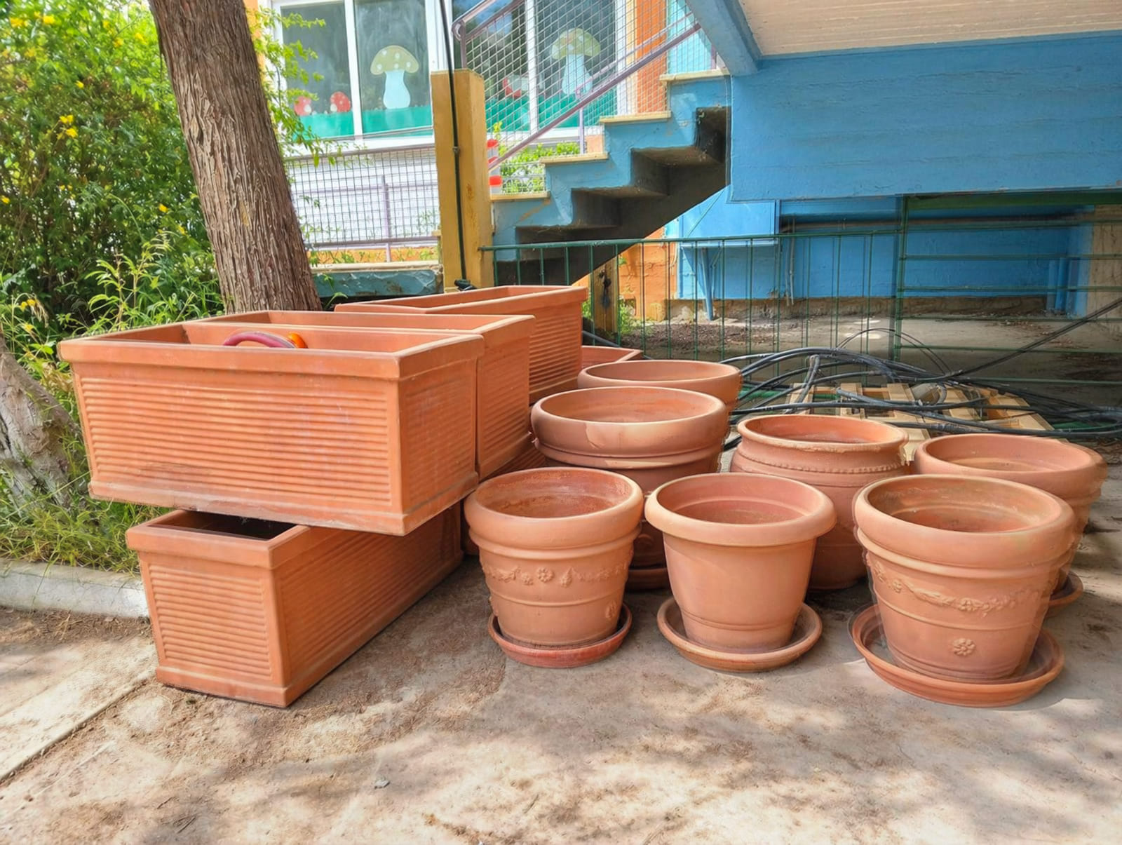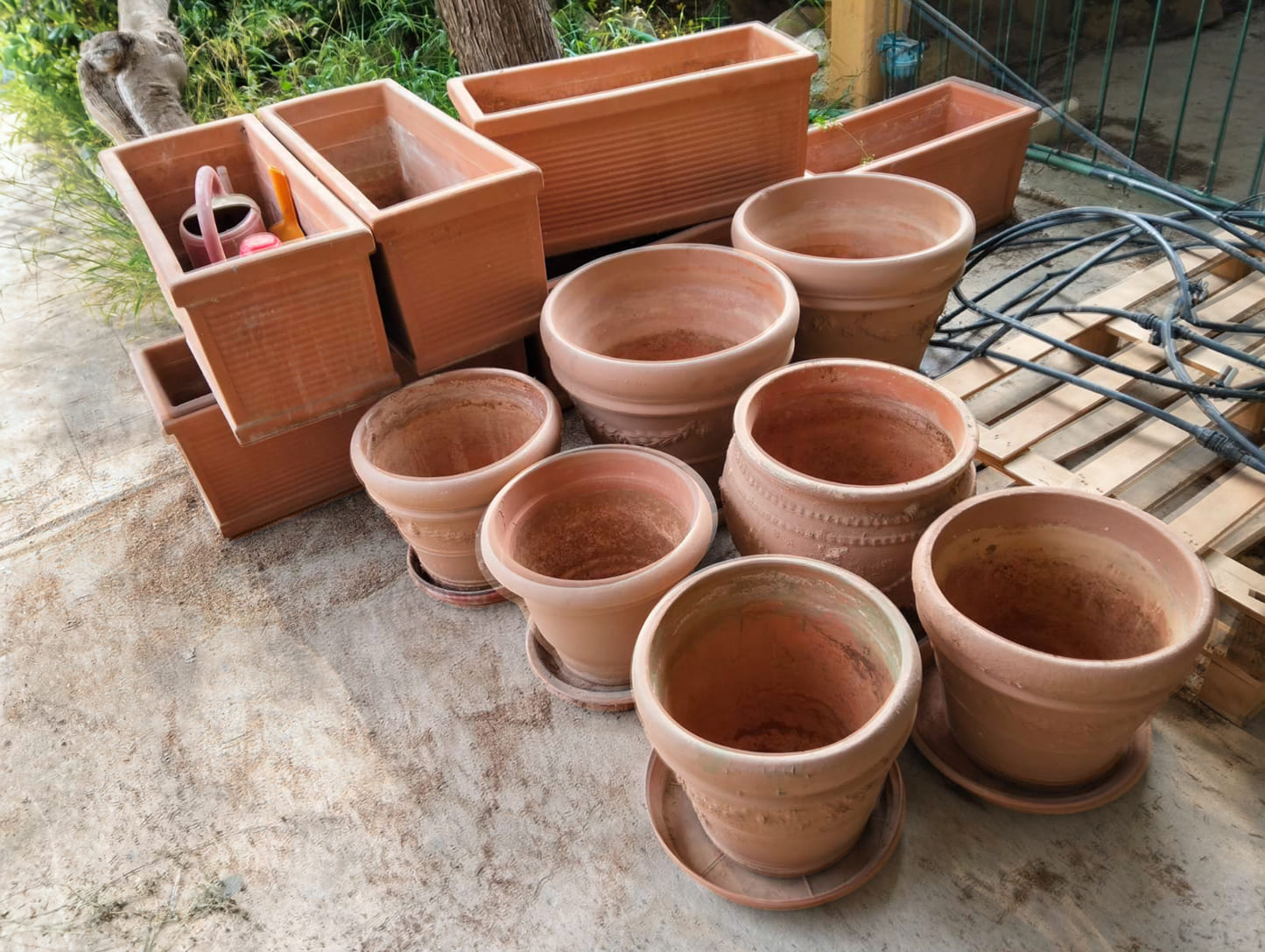- έξι (6) πήλινες ζαρντινιέρες,