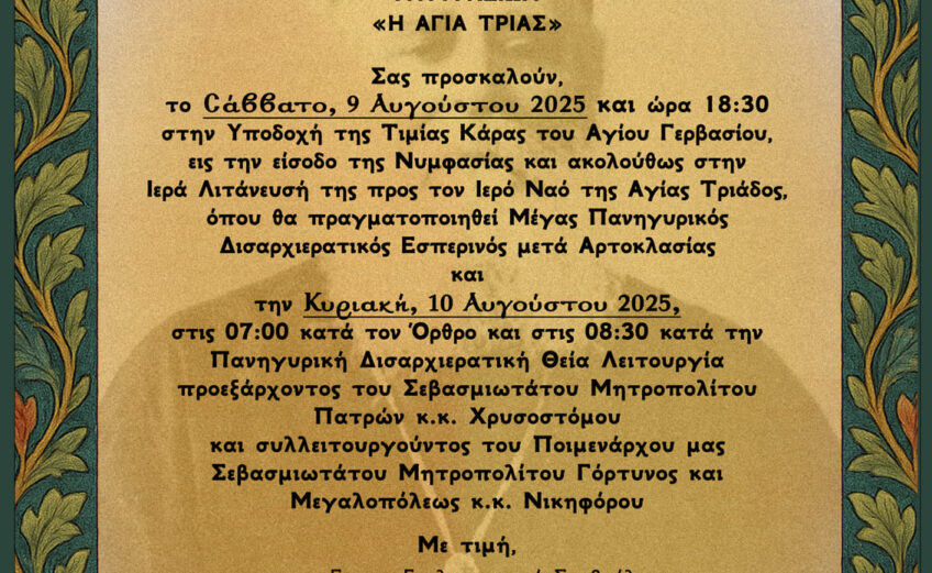 Με ιδιαίτερη τιμή και συγκίνηση, η Νυμφασία μας, υποδέχεται την Τιμία Κάρα του Αγίου Γερβασίου, του αγιασμένου τέκνου της. Το γεγονός αυτό αποτελεί ευλογία και πνευματικό ορόσημο για τον τόπο μας. Σας προσκαλούμε να συμμετάσχετε στις ιερές εκδηλώσεις, προς δόξαν…